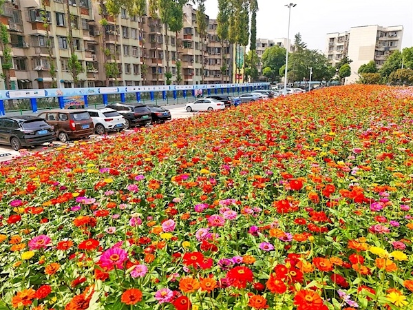 吉姆新闻记者现场目睹了4000平方米的百日草组合竞美。停在花园里的私家车看起来就像停在花园里一样,赏心悦目。一条3米多宽的通道从住宅楼延伸至菜市场、公交站、夜市及周边商业街。