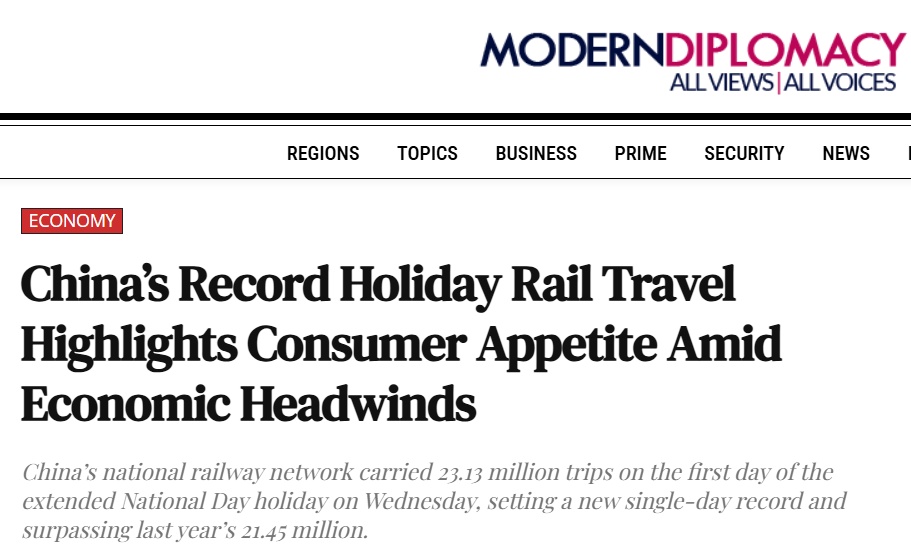 欧洲现代外交网报道称,国庆首日及为期5天的“超长黄金周”,共发送旅客2313万人次,创单日最高纪录。报告引用了官方预测,预计八天假期期间将有 23.6 亿人次到达。这是平均一天的旅行,“历史上最繁忙的假期”,约有 3 亿人次出行。